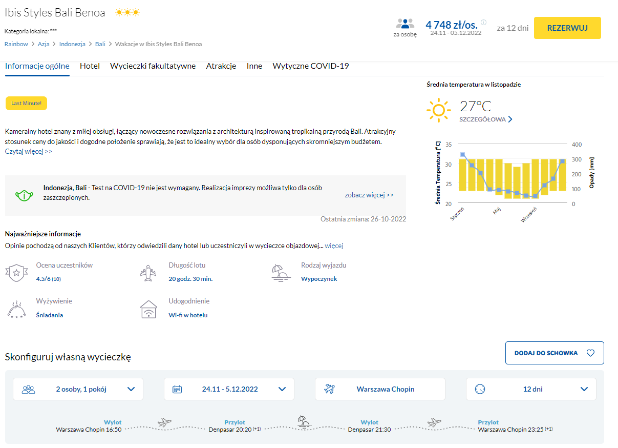 W podróż do Indonezji udasz się w terminie 24 listopada – 5 grudnia. Czeka cię lot z Warszawy do Denpasar, a w cenę podróży wliczono bagaż rejestrowany (nadawany do luku). Urlop spędzisz w 3* hotelu znanej sieci Ibis Styles Bali Benoa, który będzie świetnym miejscem na wypoczynek (na przykład w odkrytym basenie) oraz doskonałą bazą wypadową. W cenę pakietu wliczono codzienne śniadania.