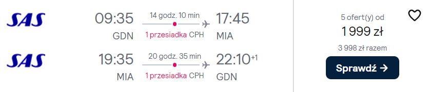 Do Miami udasz się z gdańskiego portu lotniczego im. Lecha Wałęsy w listopadzie. W obie strony polecisz linią Scandinavian Airlines z wygodnymi przesiadkami w Kopenhadze. W cenie zabrać ze sobą możesz bagaż podręczny oraz przedmiot osobisty (mały plecak lub damską torebkę).
