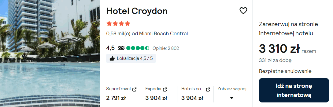 Na miejscu zatrzymasz się w 4* hotelu Croydon, od plaży Miami Beach oddalony jest o 2 minuty spokojnego spaceru. Z lotniska w okolice miejsca noclegowego dojedziesz komunikacją publiczną lub wypożyczonym samochodem.