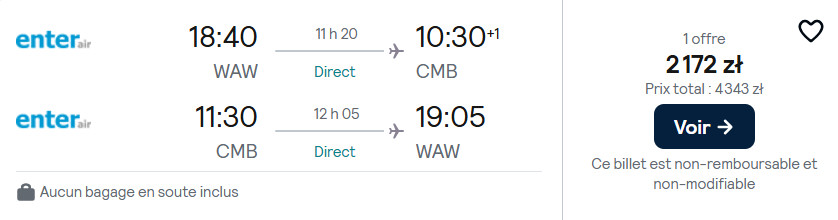 Do Sri Lanki polecisz z Warszawy czarterową linią Enter Air z międzylądowaniem w Zjednoczonych Emiratach Arabskich. W cenie zabrać ze sobą możesz bagaż rejestrowany (nadawany do luku) oraz podręczny.