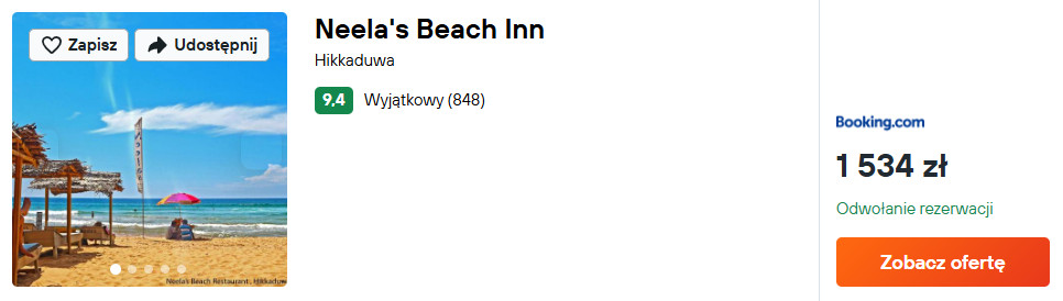 Zatrzymasz się w Neela’s Beach Inn. Jest to znakomity pensjonat położony bezpośrednio przy plaży w Hikkaduwie. Idealny dla osób szukających spokoju i relaksu. Oferuje przestronne pokoje z balkonami i widokiem na ocean.