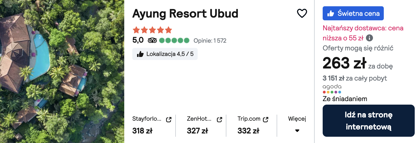 Na Bali proponuję pobyt w znakomitym 5* hotelu Ayung Resort Ubud. Na terenie obiektu skorzystasz z basenu typu infinity oraz będziesz mógł wybrać się na darmowe lekcje jogi. W cenie noclegu wliczone jest śniadanie.