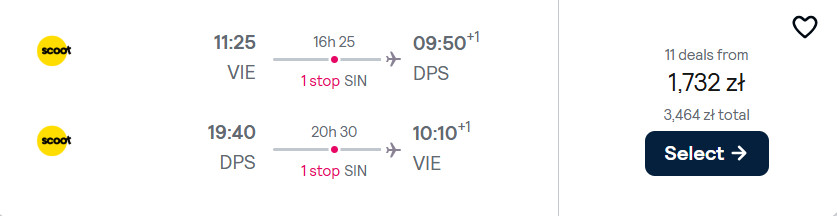 Do Denpasar polecisz z Wiednia. W obie strony podróżować będziesz linią Scoot z przesiadkami w Singapurze.