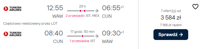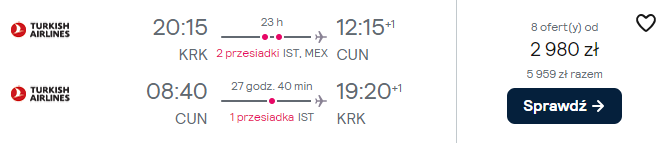 Do Cancun udasz się w terminie 25(26) sierpnia – 7(8) września. Do Meksyku polecisz z Krakowa lub Warszawy linią Turkish Airlines. Po drodze przesiądziesz się w Stambule oraz czeka cię stop techniczny w mieście Meksyk (bez opuszczania samolotu). Dłuższą przesiadkę w Turcji możesz wykorzystać na szybkie zwiedzanie. Więcej informacji znajdziesz tutaj.