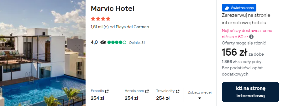 Wybrałem noclegi w znanym kurorcie Playa del Carmen. Zatrzymaj się tam w bardzo dobrze ocenianym 4* hotelu Marvic. Do twojej dyspozycji będzie klimatyzowany pokój oraz basen na dachu.
