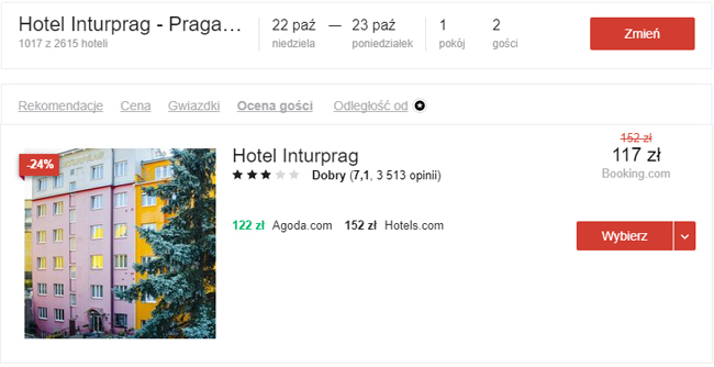 W Pradze polecam zatrzymać się w Hotelu Inturprag za 117 PLN/2 os./noc (58,5 PLN/os.)