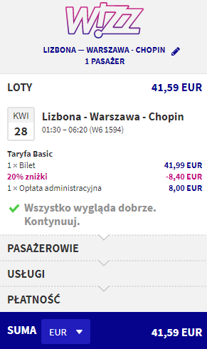 Wizz Air | Lizbona 01:30 – Warszawa 06:20 | 41,59 EUR (ok. 176 PLN z WDC) | 28 kwietnia