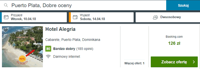 Podczas krótkiego pobytu w Dominikanie w Puerto Plata proponuję zatrzymać się w Hotel Alegria. Za spędzoną w nim noc w dwuosbowym pokoju zapłacicie 126 PLN.