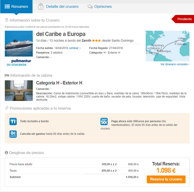 2-tygodniowy rejs statkiem z Dominikany (Santo Domingo) do Lizbony. Po drodze statek zacumuje w La Romana, Sint Maarten, Antigule oraz na Azorach w Ponta Delgada. Koszt podróży z pełnym wyżywieniem, napojami oraz podatkami dla 2 dwóch osób to 1098 EUR (ok. 549 EUR/2328 PLN za osobę).