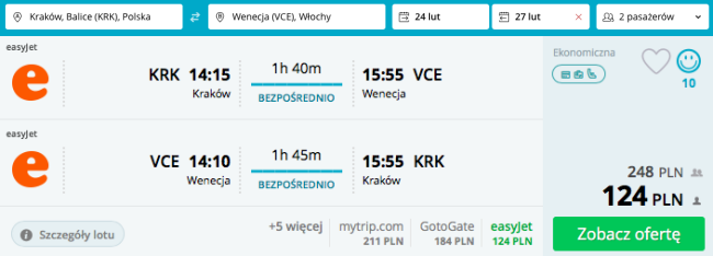 - Loty z Krakowa do Wenecji (24 – 27 lutego) za 248 PLN/2 osoby (124 PLN/osoba)
