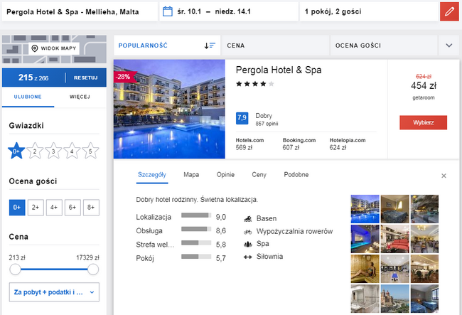 Na miejscu polecam Wam zakwaterowanie w 4* Pergola Hotel & Spa. Obiekt ten wzniesiony został na zboczu jednej z dolin w miejscowości Mellieha i oferuje piękne widoki na miejscowość, kościół, zatokę oraz wyspy Gozo i Comino, a do najbliższej plaży dotrzecie w 15 minut spacerem. Pergola Hotel & Spa posiada bardzo dobre opinie wystawione przez dotychczasowych gości, a za pobyt dwóch osób w terminie 10 – 14 stycznia zapłacicie 454 PLN.