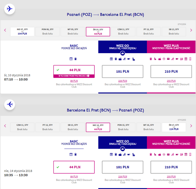 W najniższej cenie podróżuje para osób z których przynajmniej jedna posiadać musi wykupione członkostwo Wizz Discount Club. Do Barcelony bez dodatkowych kosztów lecicie z bagażem podręcznym o wymiarach 55 x 40 x 23 cm i wadze nieprzekraczającej 10 kg.