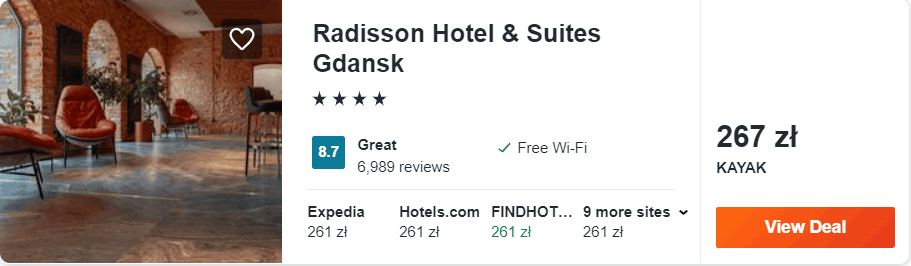Także w Gdańsku znajduje się 4* hotel Radisson Hotel & Suites, który położony jest w sąsiedztwie zielonej bramy i zielonego mostu, a od fontanny Neptuna dzieli go tylko 400 metrów. Na miejscu zapewniony będziecie mieli dostęp do sieci WiFi, krytego basenu oraz centrum fitness. Za dodatkową opłatą będziecie mogli korzystać się do sauny suchej i parowej.