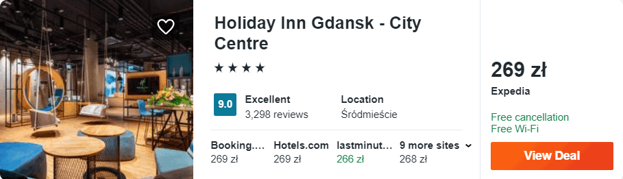 W tym samym mieście proponuję wam też noclegi w 4* hotelu Holiday Inn Gdańsk City Centre, który położony jest na Wyspie Spichrzów, a od Długiego Targu oddalony jest o jedyne 450 metrów. Na terenie całego obiektu zapewniony będziecie mieli dostęp do sieci WiFi, ponadto w cenie pobytu korzystać będziecie mogli z centrum fitness. Na 7 piętrze znajduje się Sky Bar z tarasem, z którego rozpościera się panoramicznym widok na miasto.