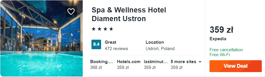 Przenosimy się na południe kraju, ale zaglądamy do Beskidu Śląskiego, gdzie proponuję wam noclegi w 4* hotelu Spa & Wellness Diament Ustroń. Jest on położony w spokojnej części miasta, na zboczu górskim – z hotelowych pokoi rozpościera się panoramiczny widok na okolicę. W cenie zakwaterowania będziecie mogli korzystać ze strefy wellness: kryty basen, wanna z hydromasażem oraz saun sucha.