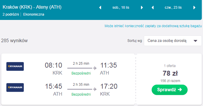 - Bezpośrednie loty do Aten (18 – 23 listopada) za 156 PLN/2 osoby (78 PLN/osoba)