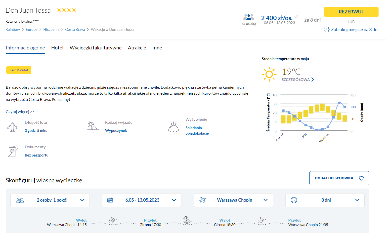 Do Hiszpanii udasz się ze stołecznego portu lotniczego im. Fryderyka Chopina w terminie 6-13 maja. W obie strony polecisz na pokładzie czarterowej linii LOT Charters. W cenie zabrać ze sobą możesz bagaż rejestrowany (nadawany do luku) oraz podręczny.