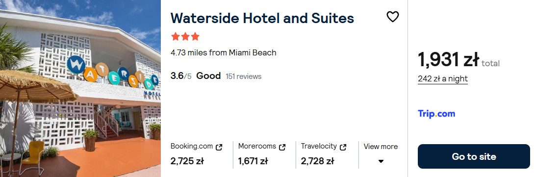 Waterside Hotel and Suites to nietypowy hotel w spokojnej okolicy między Miami a plażą — styl art déco, zaciszny basen i tylko kilkanaście minut pieszo do oceanu. Idealna ucieczka z tłumu!