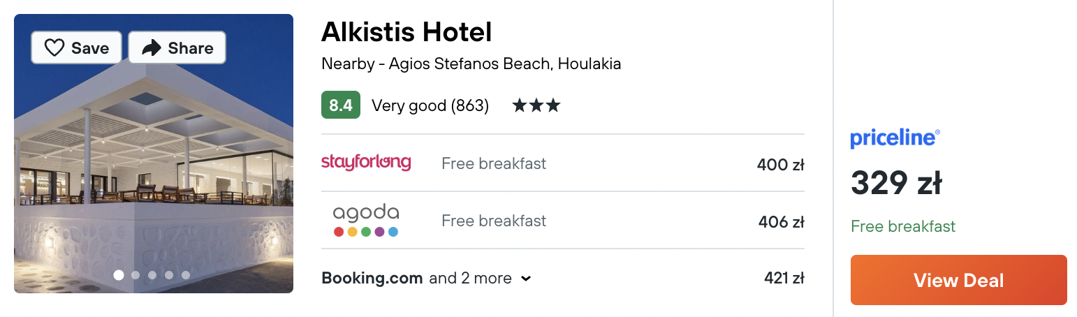 Natomiast na Mykonos proponuję pobyt w 3* hotelu Alkistis ze śniadaniami. Na miejscu jest basen i taras słoneczny. Z obiektu rozpościerają się widoki na morze.