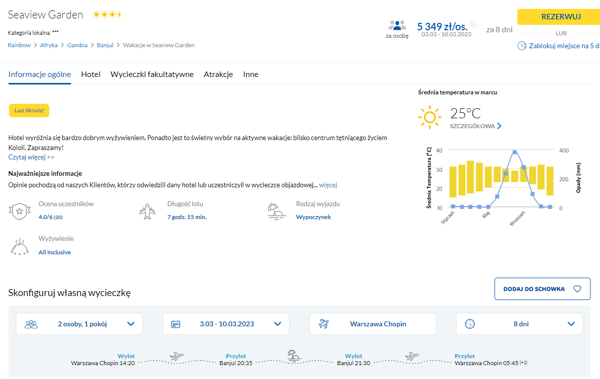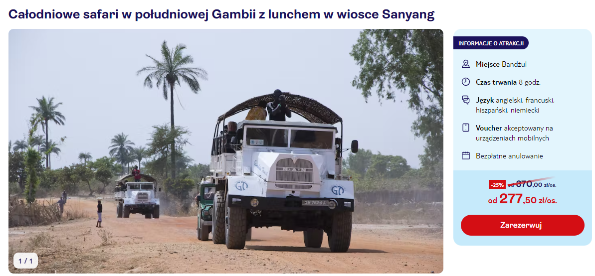 Do Afryki udasz się w terminie 3 – 10 marca. Czeka cię bezpośredni lot z Warszawy do Bandżulu. W cenę wycieczki wliczono bagaż rejestrowany (nadawany do luku).
