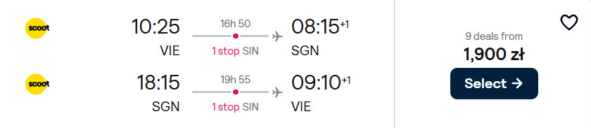 Do Bangkoku, Denpasar (Bali), Hanoi, Ho Chi Minh City, Kuala Lumpur, Manili, Singapuru oraz na Phuket polecisz linią Scoot z Wiednia. W większości przypadków czekać cię będzie przesiadka na lotnisku w Singapurze. W cenie możesz zabrać bagaż podręczny