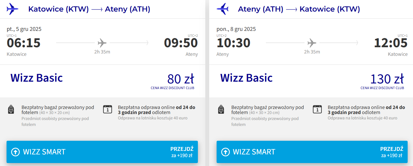 Do greckiej stolicy wybierzesz się w terminie 5-8 grudnia (piątek-poniedziałek). Czeka cię bezpośredni lot do Aten z Katowic. W podróż polecisz z Wizz Air z bagażem podręcznym.