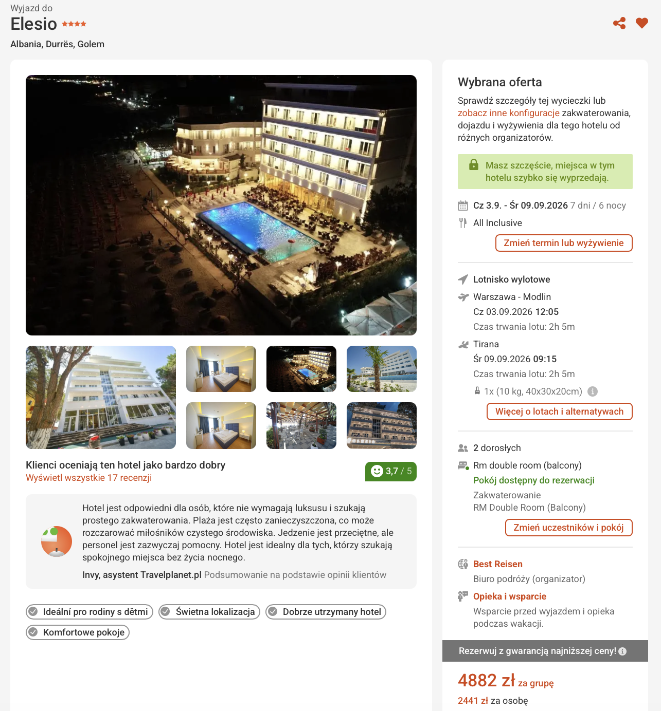 Na albańskim wybrzeżu zatrzymasz się w 4* hotelu Elesio położonym w Golem, tuż przy piaszczystej plaży. Obiekt dysponuje odkrytym basenem z tarasem słonecznym oraz wydzieloną częścią plażową z bezpłatnymi leżakami i parasolami. Goście chwalą lokalizację hotelu, bliskość plaży oraz czystość pokojów. Doceniają również komfortowe warunki i obsługę. Hotel oferuje bar, restaurację, bezpłatne Wi-Fi oraz całodobową recepcję. W pobliżu znajdują się sklepy, bary i lokalne restauracje.