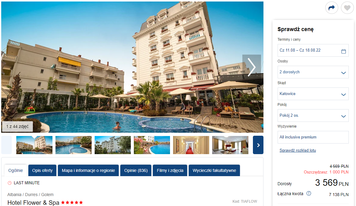 Do Albanii udacie się w terminie 11-18 sierpnia. Na miejsce polecicie bezpośrednio z Katowic lub Warszawy. Zakwaterowani będziecie w 5* Flower & Spa, który jest zlokalizowany blisko piaszczystej plaży, z wydzieloną częścią dla hotelowych gości. Będąc na miejscu będziecie mogli korzystać z hotelowego basenu z leżakami i parasolami, a także z restauracji oraz baru. Wypoczynkowi będą sprzyjać codzienne posiłki w ramach all inclusive. W cenę wliczono również transfery z lotniska do hotelu i z powrotem.