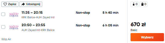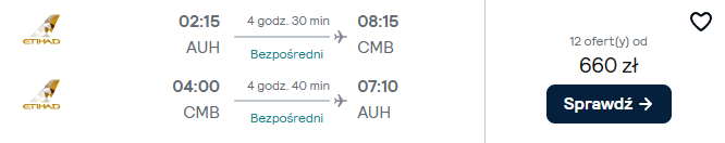 Propozycja składa się z dwóch oddzielnych rezerwacji. Pierwsza z nich to loty na trasie Kraków – Abu Zabi – Kraków w terminie 13-29 listopada. Druga to Abu Zabi – Kolombo – Abu Zabi w terminie 14-29 listopada. Do Zjednoczonych Emiratów Arabskich polecisz linią Wizz Air, natomiast do Sri Lanki Etihad. W przypadku obu linii lotniczych w cenę wliczony został bagaż podręczny.