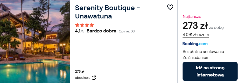 W Sri Lance zatrzymaj się w bardzo dobrze ocenianym 4* hotelu butikowym Serenity. Na jego terenie znajdziesz między innymi strefę spa, restaurację, siłownię oraz kawiarnię. W cenę noclegu wliczone zostały śniadania.