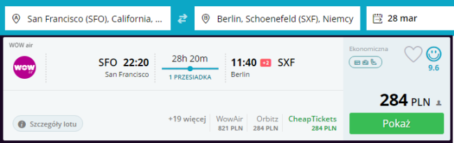 WOW air | San Francisco 22:20 – Berlin Schönefeld 11:40 |284 PLN| 28 (29) marca