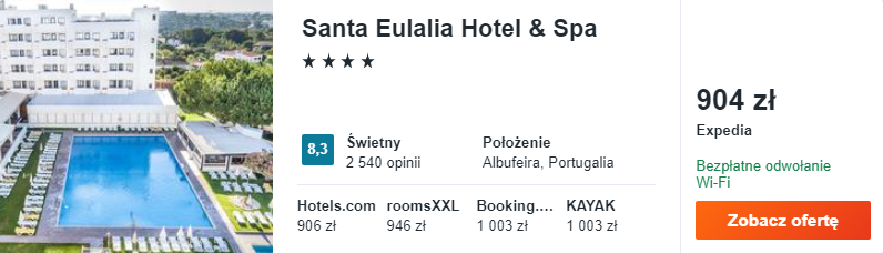 Wybrałem dla was zakwaterowanie w bardzo dobrze ocenianym 4* Santa Eulalia Hotel & Spa. Znajduje się on w Albufeirze, znanej miejscowości wypoczynkowej. Będzie to nie tylko świetne miejsce na relaks w czasie waszego urlopu, ale również korzystna baza wypadowa do odkrywania najciekawszych miejsc w okolicy.