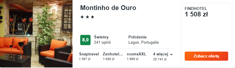Wybrałem dla was zakwaterowanie w 3* hotelu Montinho de Ouro. Położony w Lagos, będzie dobrą bazą wypadową oraz miejscem na wypoczynek w trakcie gorących dni – na przykład w odkrytym basenie.