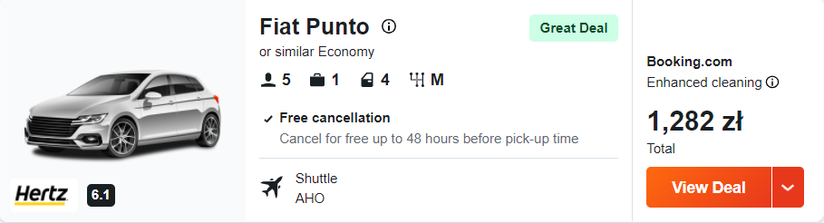Podczas wyjazdu na włoską wyspę chcielibyście także coś zwiedzić? W takim razie rekomenduję wam wypożyczyć samochód zaraz po przylocie do Alghero. Na początku wakacyjnego sezonu za wynajem Fiata Punto lub podobnego modelu zapłacicie 183 PLN/doba.