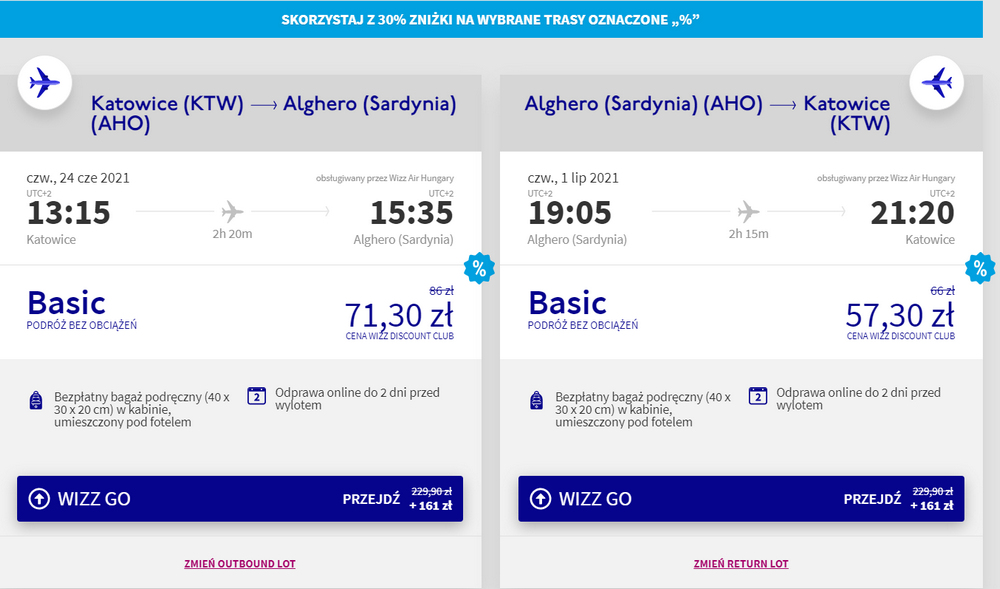 Do Alghero podróżować będziecie z katowickiego lotniska w Pyrzowicach na pokładzie samolotu linii Wizz Air z wliczonym małym bagażem podręcznym. Bilety w rewelacyjnej cenie 129 PLN dostępne są dla członków Wizz Discount Club, osoby bez WDC zapłacą nieco więcej.