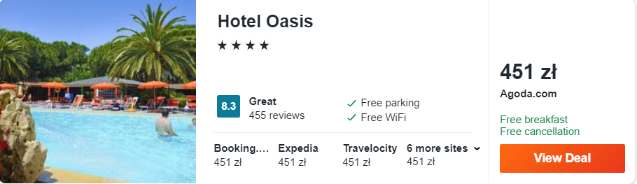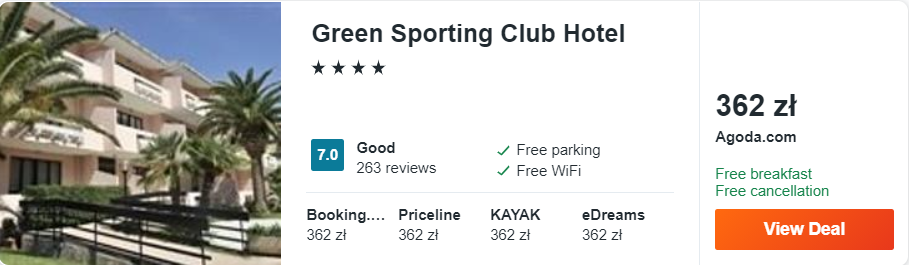 Dowiedzcie się więcej o tym hoteluNatomiast jeżeli jesteście w stanie wydać nieco więcej na nocleg, to zdecydujcie się na pobyt w 4* hotelu Oasis. Znajduje się on w sąsiedztwie plaży Maria Pia. Na terenie obiektu mieści się odkryty basen i taras słoneczny, a w cenę noclegów wliczone są codzienne śniadania.
