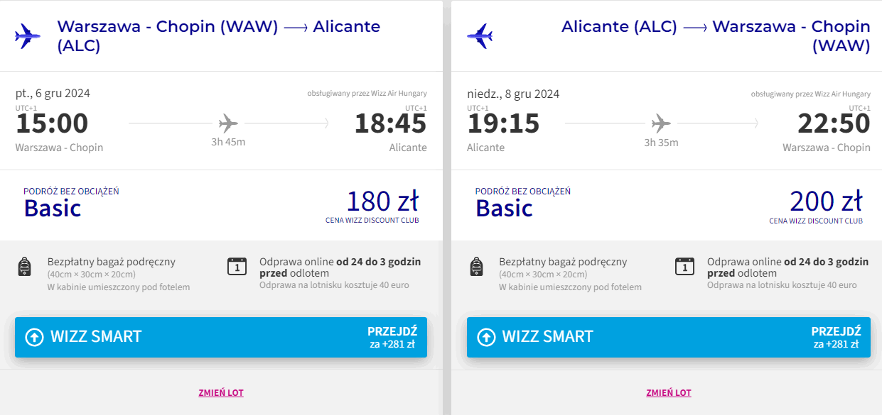 Do Alicante udasz się z Warszawy w piątek (6 grudnia) o godzinie 15:00. Natomiast do stolicy Polski wrócisz w niedzielę (8 grudnia), a wylot zaplanowany jest na godzinę 19:15. W obie strony polecisz linią Wizz Air. Bilety w najniższej cenie dostępne są dla członków Wizz Discount Club. Chętni na loty bez WDC zapłacą więcej.