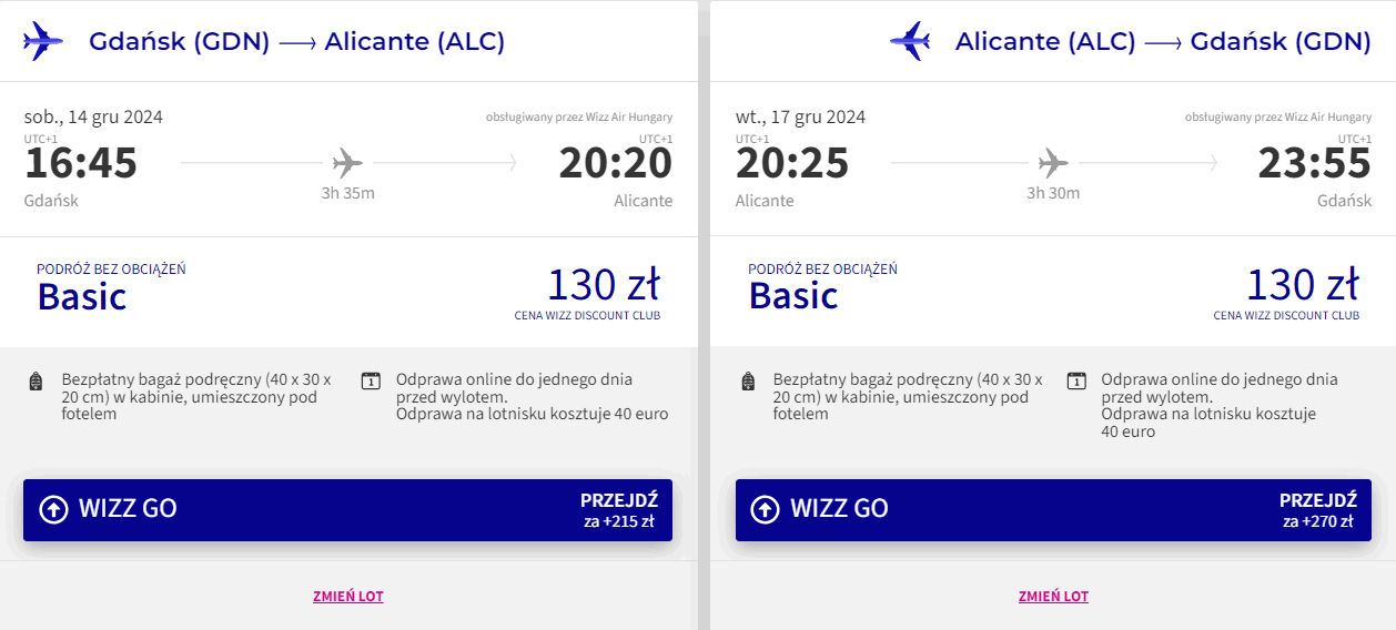 Do Alicante wylecisz z gdańskiego portu lotniczego w sobotę (14 grudnia) o godzinie 16:45. W drogę powrotną udasz się we wtorek (17 grudnia), a wylot jest zaplanowany na godzinę 20:25. W obie strony podróżować będziesz bezpośrednio linią Wizz Air z bagażem podręcznym. Bilety w najniższej cenie dostępne są dla członków Wizz Discount Club. Chętni na loty bez WDC zapłacą więcej.