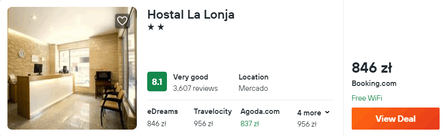 W Hiszpanii zakwaterowanie będziecie w hotelu La Lonja, który od ścisłego centrum Alicante oddalony jest o jedyne 500 metrów. Z lotniska w okolice miejsca noclegowego dojedziecie autobusem C6 za 3,85 EUR lub wypożyczonym samochodem – szczegóły poniżej.