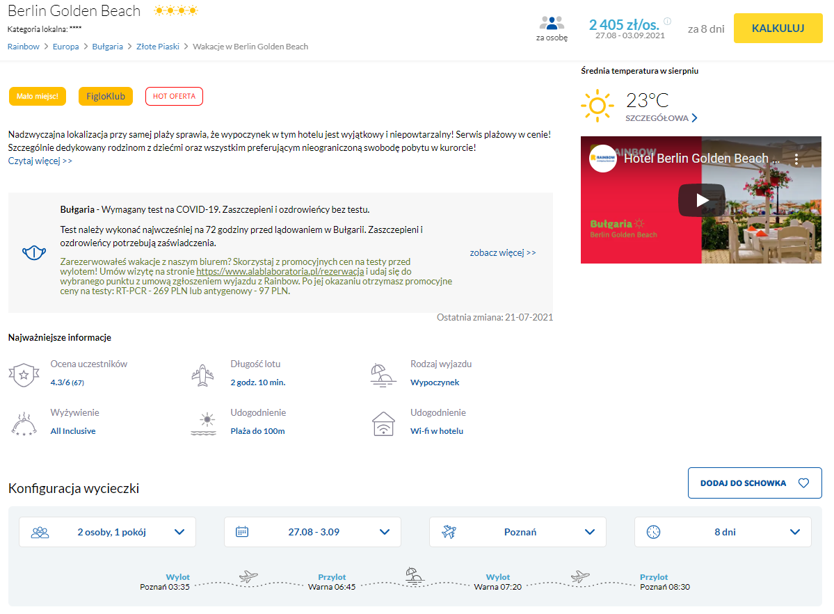 4* hotel Berlin Golden Beach położony jest przy samej plaży w kurorcie Złote Piaski. Do dyspozycji gości oddano m.in. basen oraz brodzik dla dzieci. Wszystkie pokoje dysponują balkonem i wyposażone są w minibar oraz prywatną łazienkę z bezpłatnym zestawem kosmetyków. Uwaga: obiekt może pochwalić się bogatą siatką animacji i zajęć sportowych dla najmłodszych.