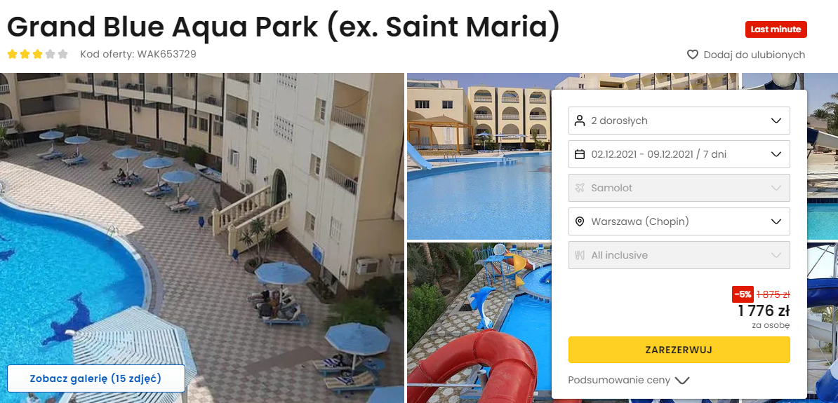 Będziecie zakwaterowani w 3* Grand Blue Aqua Park. Do waszej dyspozycji będzie tam m.in. restauracja oferująca wyżywienie w formie zróżnicowanego all inclusive, odkryty basen ze zjeżdżalniami, komfortowo urządzone pokoje oraz bogate zaplecze sportowe.