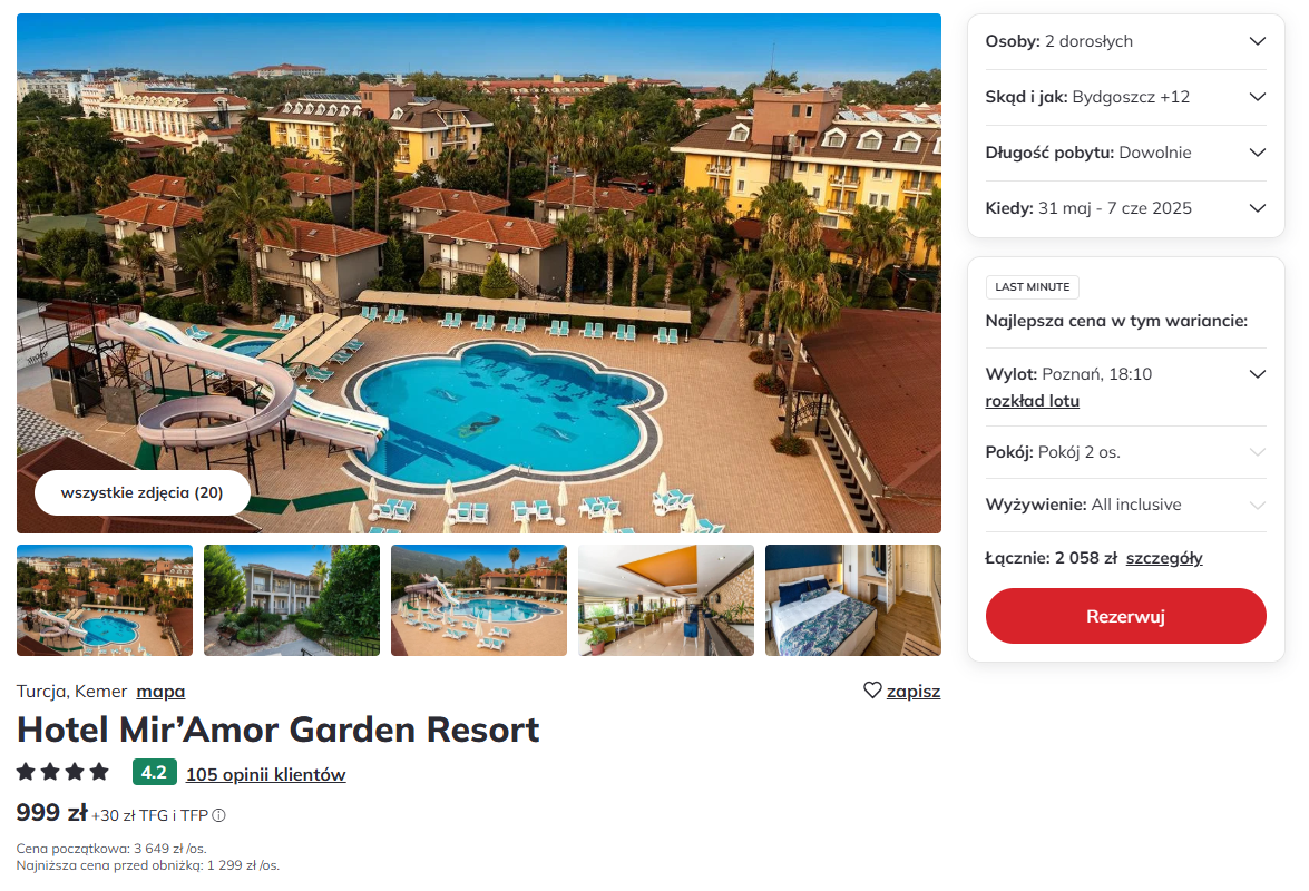 W ramach każdej propozycji otrzymasz przeloty z bagażem rejestrowanym (nadawanym do luku), transfery na trasie lotnisko – hotel – lotnisko, all inclusive oraz podstawowe ubezpieczenie.