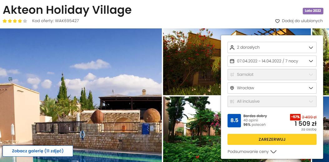 Na miejscu będziecie zakwaterowani w 4* aparthotelu Akteon Holiday Village. Położony 500 metrów od plaży, niedaleko centrum Pafos, będzie doskonałym miejscem na wypoczynek oraz dogodną bazą wypadową do odkrywania uroków okolicy.