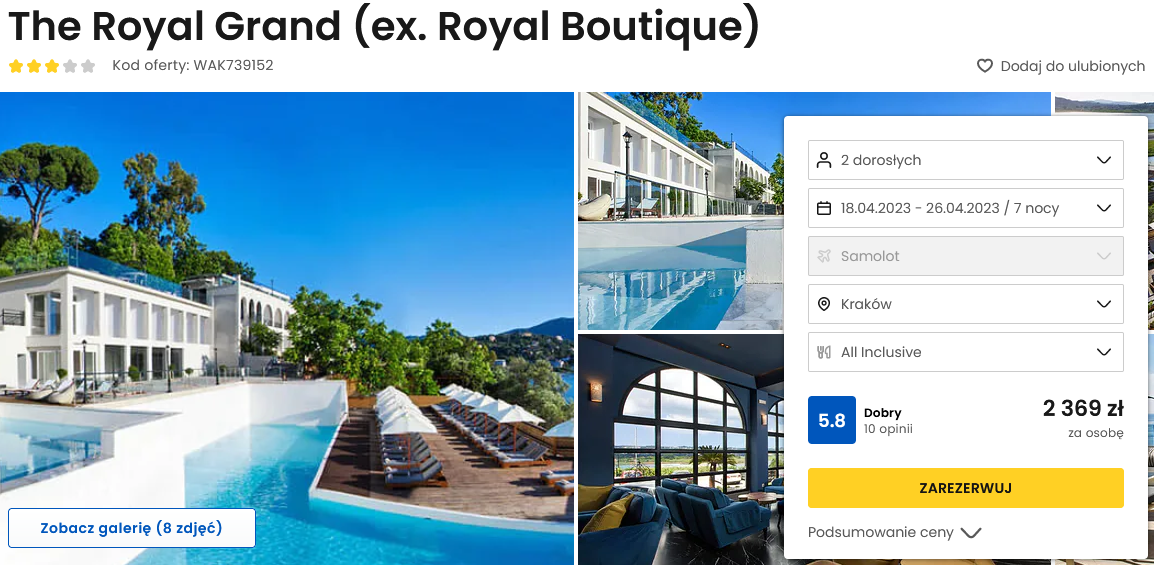 Na Korfu zatrzymaj się w wyjątkowym hotelu. 3* The Royal Grand oferuje zakwaterowanie w klasycznie urządzonych, eleganckich pokojach, odkryty basen, bogatą ofertę all inclusive oraz wspaniałe widoki na okoliczną zatokę wraz z pasem startowym lotniska.