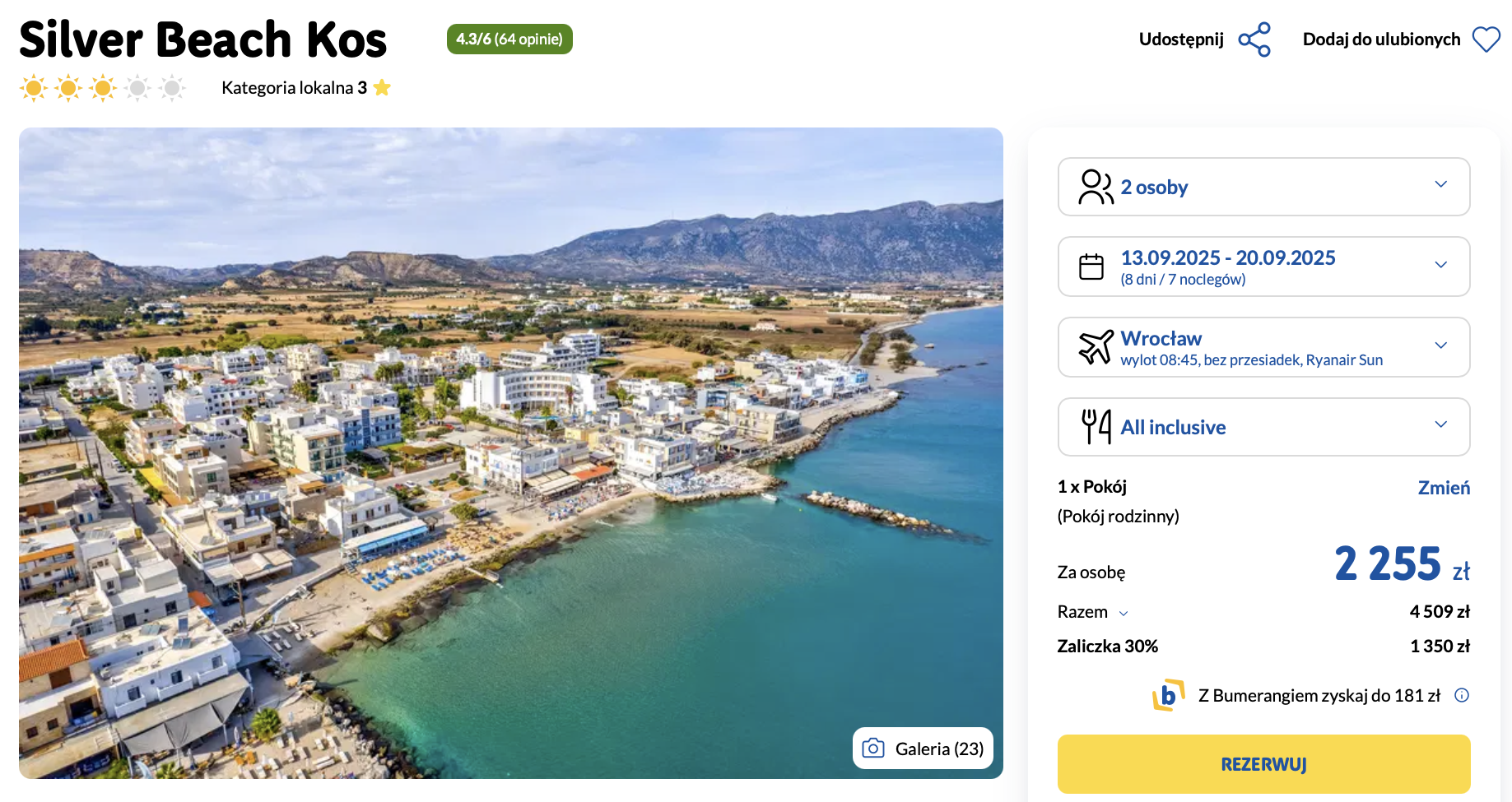 Lot na grecką wyspę Kos odbędzie się z Wrocławia, Warszawy lub Poznania w terminie 13-20 września. Podróż liniami Ryanair Sun trwa około 2 godziny i 40 minut. W cenie wyjazdu znajduje się bagaż rejestrowany do 20 kg oraz podręczny do 10 kg na osobę.