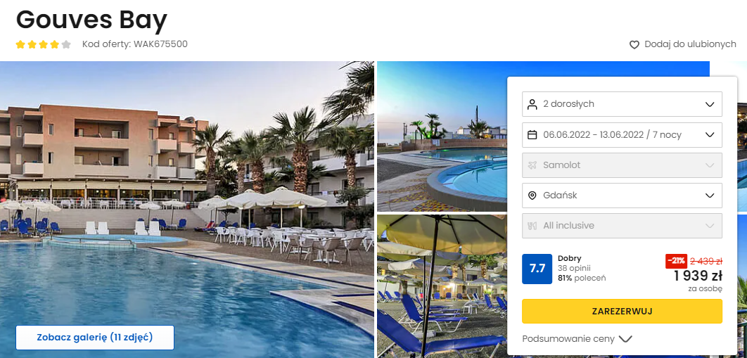 Będziecie zakwaterowani w 4* hotelu Gouves Bay. Znajduje się on w pobliżu Heraklionu oraz malowniczej zatoki. Na miejscu będziecie mogli korzystać m.in. z odkrytego basenu, wyżywienia w formule all inclusive oraz ciekawych animacji.