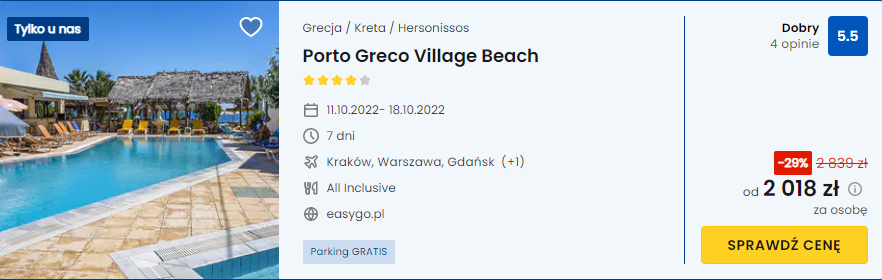 Będziecie zakwaterowani w 4* hotelu Porto Greco Village Beach. Przy hotelu znajdziecie piaszczystą plażę, a na terenie kompleksu będziecie mogli zrelaksować się w odkrytym basenie lub na tarasie słonecznym. W restauracji serwowane są dania kuchni śródziemnomorskiej w formule all inclusive.