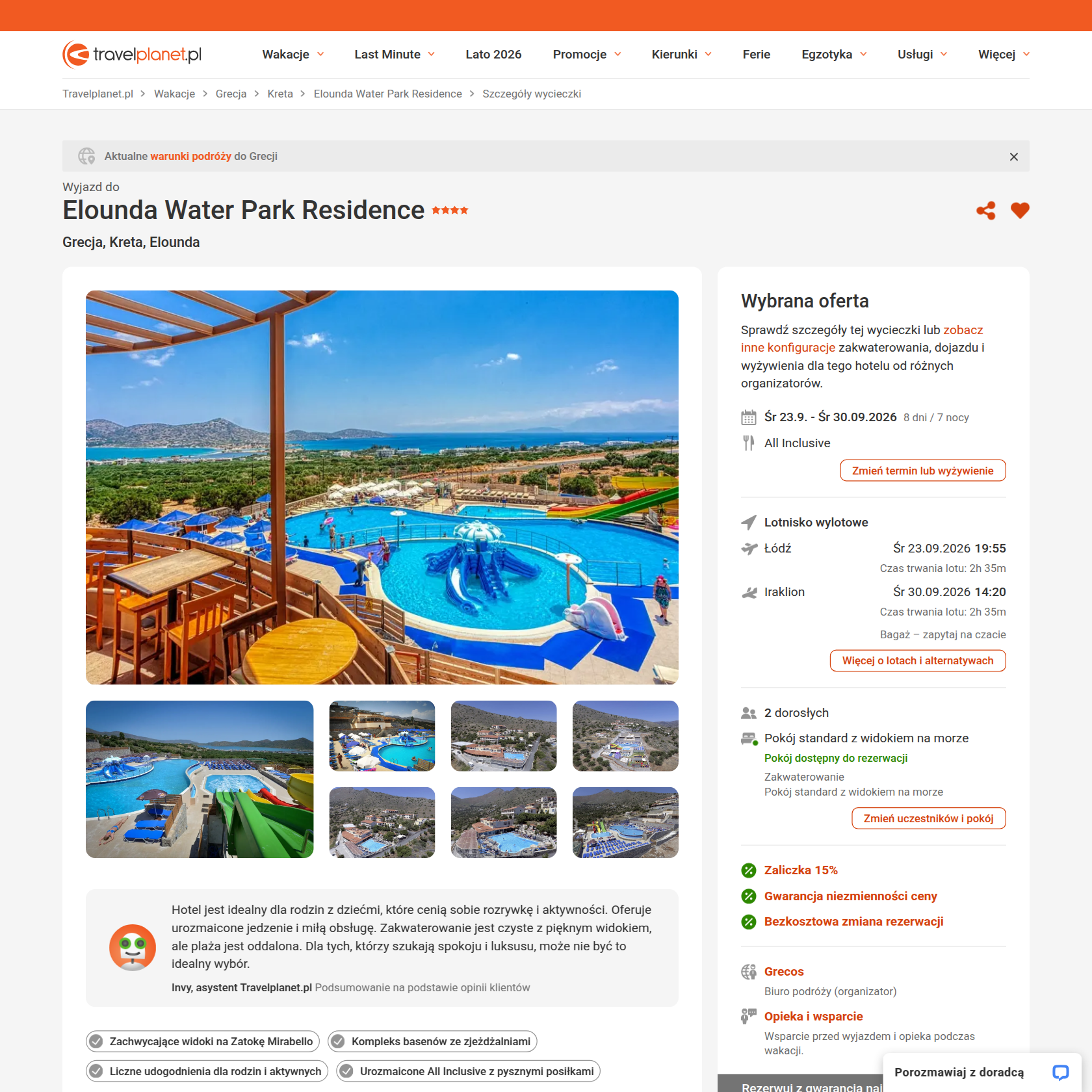 Hotel Elounda Water Park Residence to rodzinny kompleks położony na wzniesieniu z przepięknym widokiem na zatokę Mirabello i wyspę Spinalonga. Goście chwalą przede wszystkim spektakularne widoki, świetną obsługę i grecką gościnność personelu oraz bogatą infrastrukturę dla dzieci. W ofercie hotelu znajduje się aquapark z trzema zjeżdżalniami, baseny z wodą morską, mini klub, kort tenisowy, mini golf, boisko multisport oraz spa. Wszystkie pokoje mają balkon lub taras z widokiem na morze. Hotel oferuje również bezpłatny transfer do centrum Eloundy.