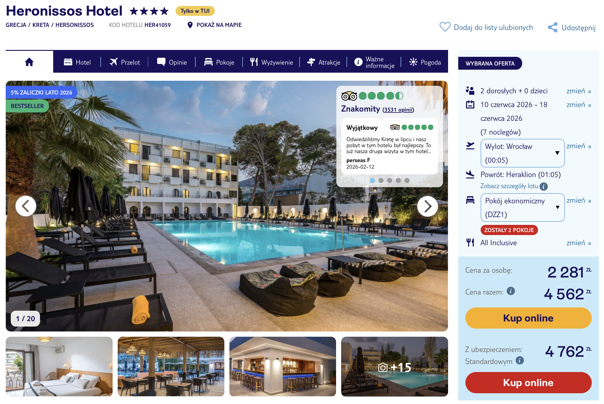 Na miejscu zamieszkasz w 4* Heronissos Hotel w nadmorskim Hersonissos. Goście chwalą lokalizację hotelu – bliskość plaży i centrum z tawernami sprawia, że można łatwo poznać lokalną kulturę. Obiekt oferuje basen w ogrodzie ze słonecznym tarasem, bar przy basenie oraz restaurację serwującą dania kuchni greckiej i międzynarodowej. Opinie podkreślają przyjazną atmosferę i smaczne posiłki. Z hotelu w 25 minut dotrzesz do lotniska. W okolicy warto odwiedzić Akwarium CretAquarium, starożytne ruiny Knossos czy port w Heraklionie.
