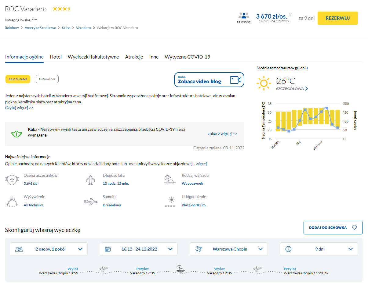 Na Kubę polecisz w terminie 16 – 24(25) grudnia. Czeka cię bezpośredni lot z Warszawy, realizowany na pokładzie Dreamlinera w barwach PLL LOT. W cenę pakietu wliczono podróż z bagażem rejestrowanym (nadawanym do luku).